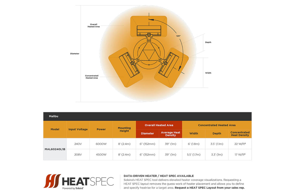 Solaira Malibu Fixed Location 6000 Watt Radiant Infrared Electric Patio Heater | 240V